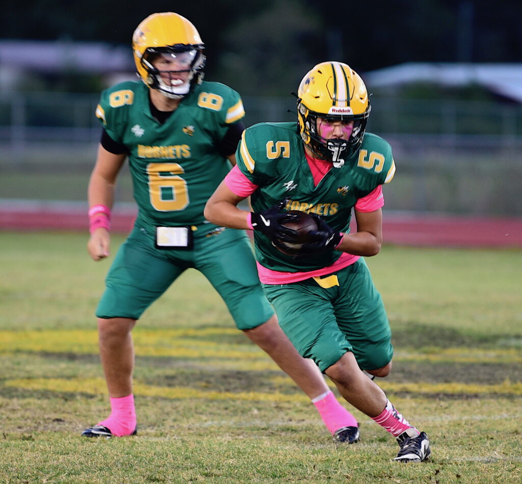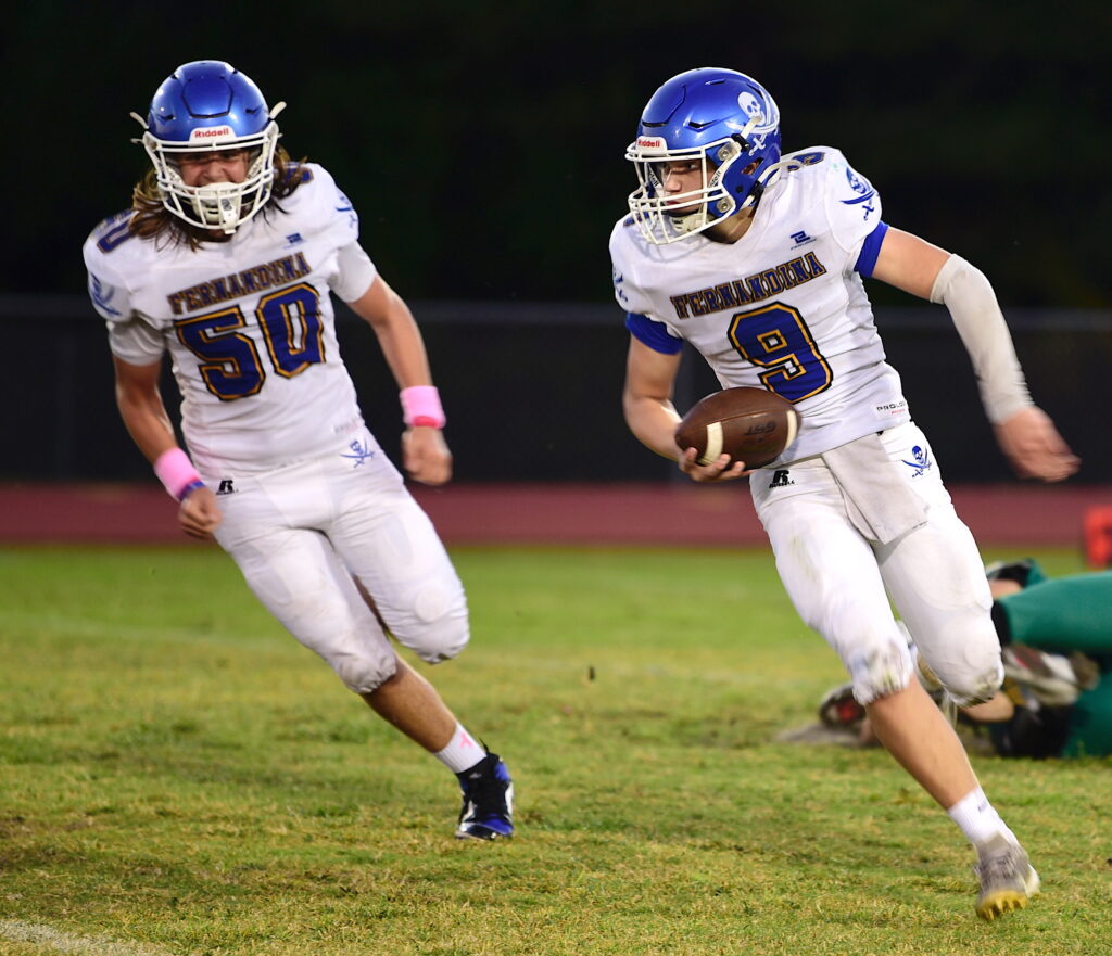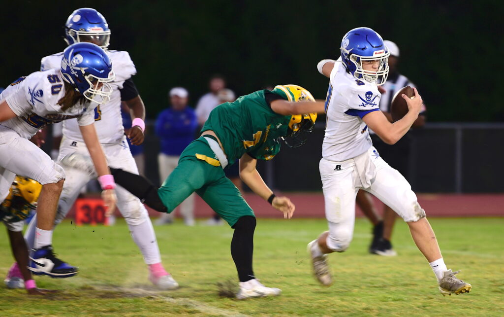 Pirate quarterback Connor Goodman completed two of three passes for 19 yards and had seven carries for 29 yards and a Pirate TD. He also had a pair of tackles and an assist for the defense.