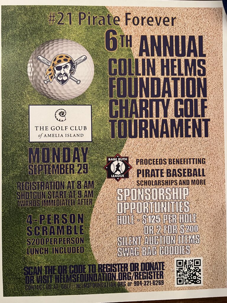 The sixth annual Collin Helms Foundation Charity Golf Tournament will be held Sept. 29 at the Golf Club of Amelia Island. Registration begins at 8 a.m., and there is a shotgun start at 9 a.m.