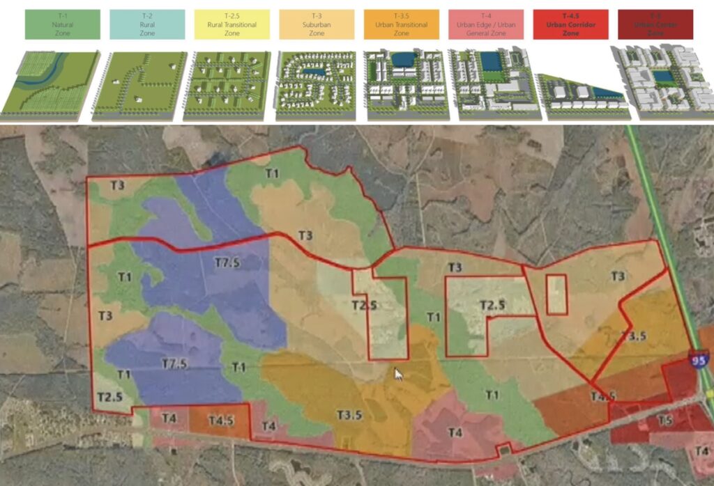 The rezoning plan divides the property into eight transects, each with a distinct zoning designation. The largest include:
