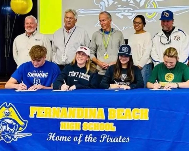 Four Fernandina Beach High School athletes signed national letters of intent to play their respective sport on the next level during a ceremony in the multi-purpose room on Dec. 3. Pictured are, front row from left, Logan Cook (Rollins College), Cora Foxwell-Jones (Stony Brook University), Grace Scuderi (Berry College) and Rylee Murallo (Piedmont College); back row, athletic director Mike Woodard, swim coach Bill Stewart, cross country head coach Dave Reinhart and assistant coach Melanie Wright and softball coach Cris Holland. Photo by Missy Murallo