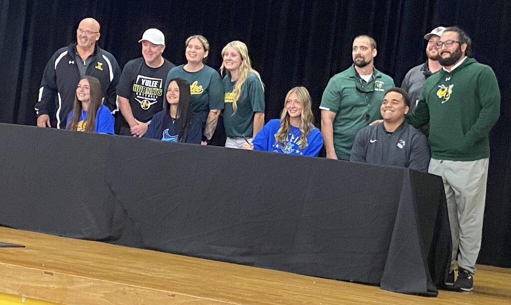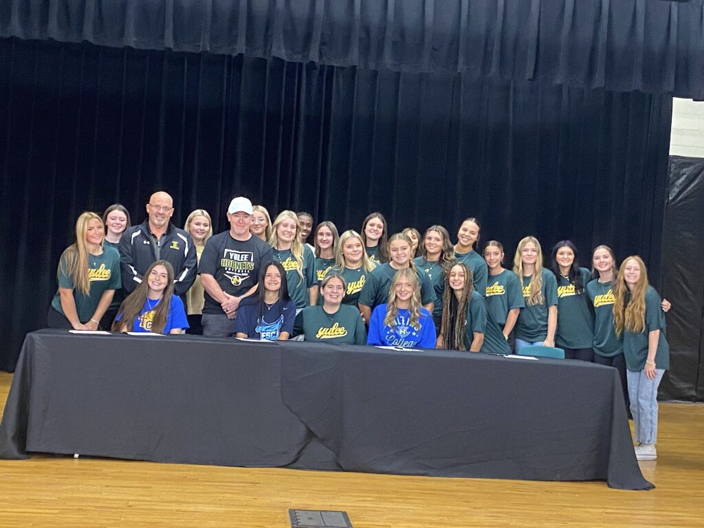 Yulee High School senior student-athletes Addison Kennedy (Trinity Baptist College), Kierstin Northern (Florida State College at Jacksonville), Samantha Joiner (Rollins College) and Turtle Ricks (Charleston Southern University), front row from left, signed national letters of intent on Dec. 3. Kennedy, Northern and Joiner will play softball on the next level, and Ricks will play football. They are pictured with their coaches. Photos by Beth Jones/Nassau NewsLine