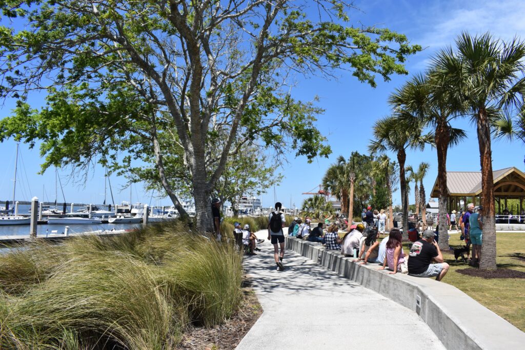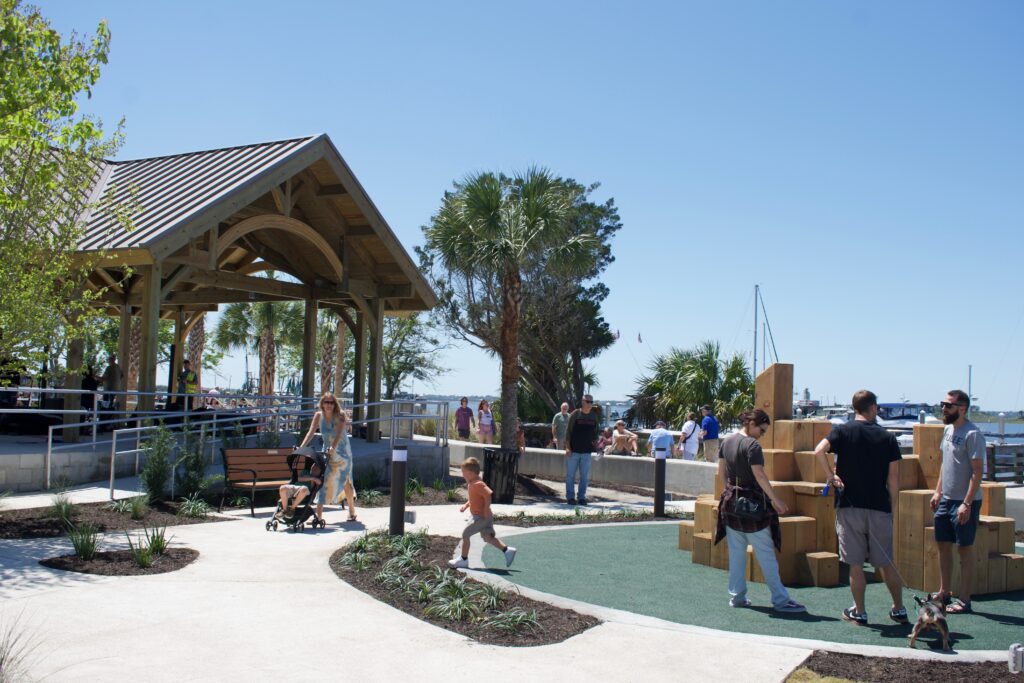 The park was visibility new, with freshly laid mulch, newly planted native palms and spotless seating areas. Families gravitated toward the playground and open green spaces, while others paused along the marina-facing walkway to take in sweeping views of the water and easy access to the docks below.