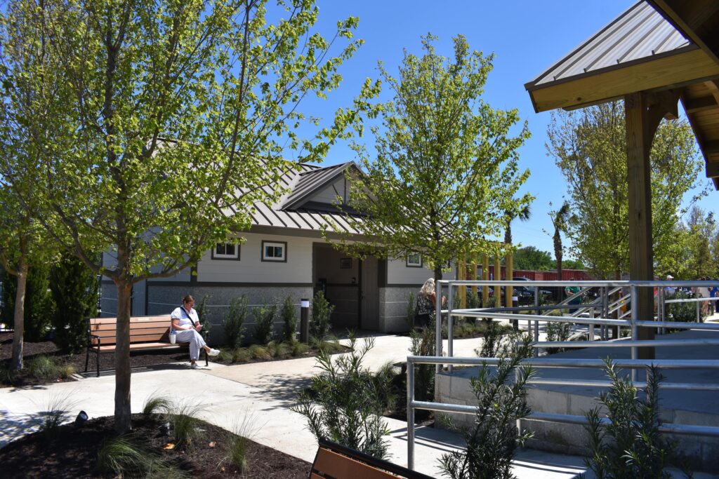 Public art and local history are woven throughout the park’s landscape. A shrimp boat statue pays tribute to the area’s fishing heritage, while an anchor installation and a series of 22 memorial benches — some still awaiting dedication — offer places for reflection.